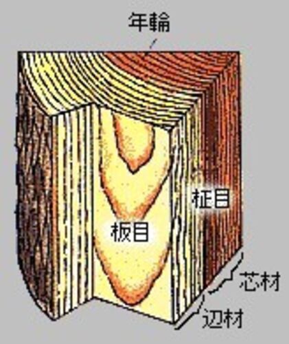 木を年輪(木目)に対して平行に切っで出来る面が「板目」、 また垂直に切った面が「柾目」になる。 柾目は大木でないと沢山採れないので数が少なく高価。 一方、板目は同じものが二つとない木目が表現でき、工芸品として楽しめる。