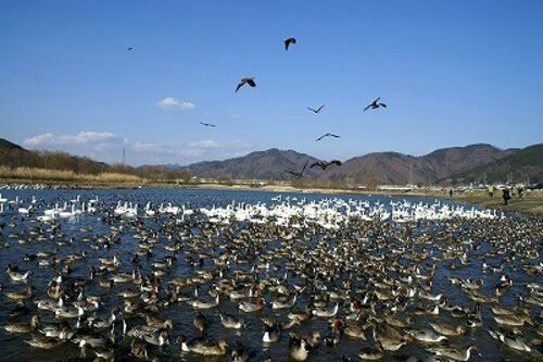 安曇野「御宝田池」には鴨も沢山いる。 白鳥・鴨そして空の鳶が対決? と言っても争いでは無いでしょう。静かな池である。時間がくれば、白鳥も数を増すと思われるがやや劣勢だ。 鴨には沢山種類があるようだが、どれがどれだか分からない。 毛並みがこんな…