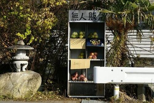 田舎道を走ると所々に「無人売店」が目立つ。 農家の方でしょう。収穫された野菜や果実を並べて販売しているが、 もちろん誰もいない露天店。お金は箱の中に自発的に入れる。 お賽銭箱みたいだ。 中にはタダで持っていく人もいるかも知れないが、 それでも店…