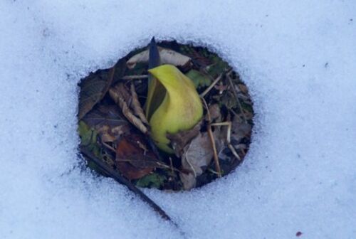 自らの熱で雪を溶かすというザゼンソウ。裏山にはまだ雪が、しかし見事にザゼンソウが周りの雪を溶かして・・・ ザゼンソウの里風景