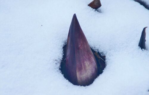 雪を自らの熱で溶かして芽を出すと言われる「座禅草」 日陰の雪の融けてない場所からニョキニョキと・・・ こちら「クリスマスローズ」 冬の花だけあってさすがに強い。 でもみじめですね(>_