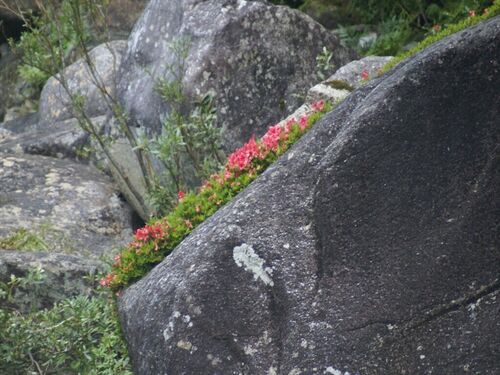 木曾路の渓流、気温が25~26度と別世界。 岩には赤い苔? いや、ツツジですね。