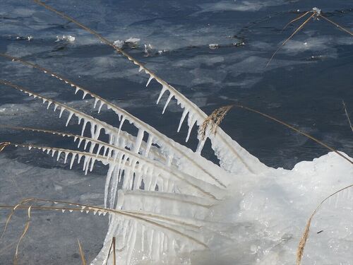 急流や湖畔での飛沫が、草につて氷柱になる。 暦では立春なのに まだまだ厳冬の信濃路です。