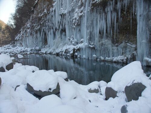 滝が凍る氷柱を「氷瀑」と言うらしい。 信州でも寒い木曽路の「白川氷瀑」 土手から噴き出る滝が凍ります。 長さ200mほど高さが10m、 見事な氷柱です。